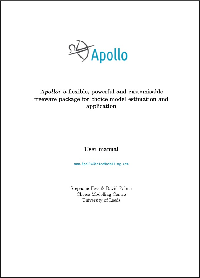 - Hess, S. & Palma, D. (2019), *Apollo: a flexible, powerful and customisable freeware package for choice model estimation and application, Journal of Choice Modelling, Volume 32, September 2019, 100170
